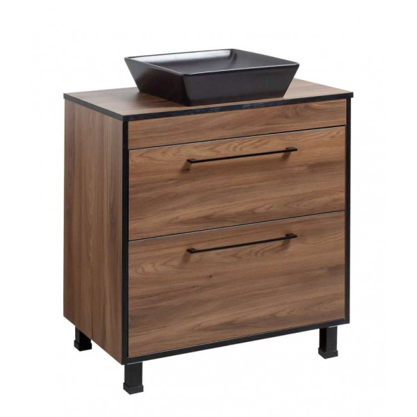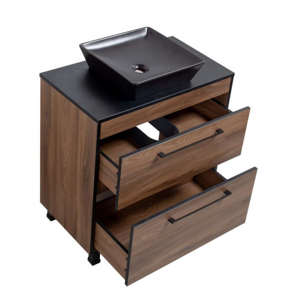 Тумба Хілтон Т-8 зі стільницею 80 чорн.дерево/дуб Валенсія + чаша Адель чорна (05023) ідеально підходить для тих, хто цінує стиль та функціональність, і стане чудовим доповненням до декору вашої ванної кімнати, практична та надійна модель в умовах вологості, що притаманна ванним кімнатам. Просторі шухляди забезпечують достатньо місця для зберігання, гарантуючи, що ваші необхідні речі будуть акуратно заховані, зберігаючи безтурботну атмосферу.