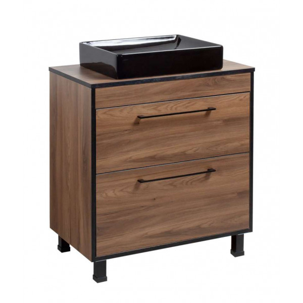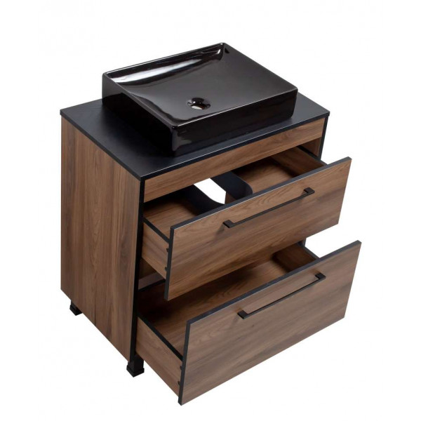 Тумба Хілтон Т-8 зі стільницею 80 чорн.дерево/дуб Валенсія + чаша Грейс чорна (05025) ідеально підходить для тих, хто цінує стиль та функціональність, і стане чудовим доповненням до декору вашої ванної кімнати, практична та надійна модель в умовах вологості, що притаманна ванним кімнатам. Просторі шухляди забезпечують достатньо місця для зберігання, гарантуючи, що ваші необхідні речі будуть акуратно заховані, зберігаючи безтурботну атмосферу.