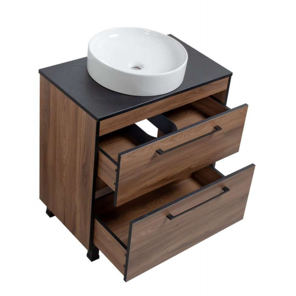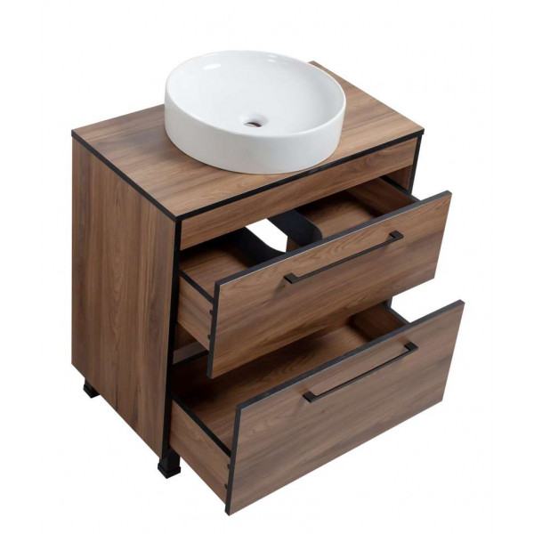 Тумба Хілтон Т-8 зі стільницею 80 чорн.дерево/дуб Валенсія + чаша Луна (05026) ідеально підходить для тих, хто цінує стиль та функціональність, і стане чудовим доповненням до декору вашої ванної кімнати, практична та надійна модель в умовах вологості, що притаманна ванним кімнатам. Просторі шухляди забезпечують достатньо місця для зберігання, гарантуючи, що ваші необхідні речі будуть акуратно заховані, зберігаючи безтурботну атмосферу.