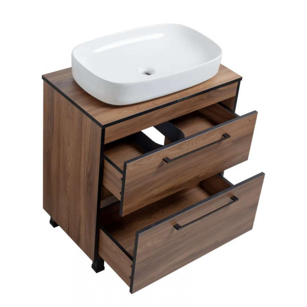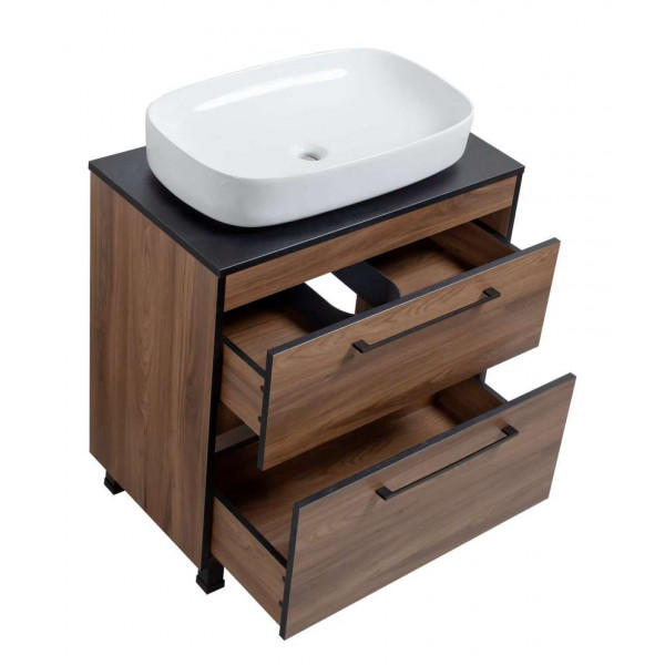 Тумба Хілтон Т-8 зі стільницею 80 чорн.дерево/дуб Валенсія + чаша Макс (05027) ідеально підходить для тих, хто цінує стиль та функціональність, і стане чудовим доповненням до декору вашої ванної кімнати, практична та надійна модель в умовах вологості, що притаманна ванним кімнатам. Просторі шухляди забезпечують достатньо місця для зберігання, гарантуючи, що ваші необхідні речі будуть акуратно заховані, зберігаючи безтурботну атмосферу.