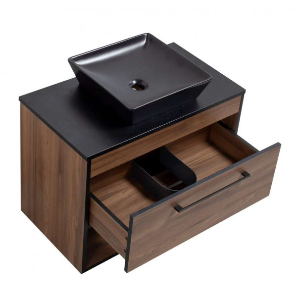 Тумба Хілтон Т-3 зі стільницею 80 чорн.дерево/дуб Валенсія + чаша Адель чорна (05017) ідеально підходить для тих, хто цінує стиль та функціональність, і стане чудовим доповненням до декору вашої ванної кімнати, практична та надійна модель в умовах вологості, що притаманна ванним кімнатам. Просторі шухляди забезпечують достатньо місця для зберігання, гарантуючи, що ваші необхідні речі будуть акуратно заховані, зберігаючи безтурботну атмосферу.